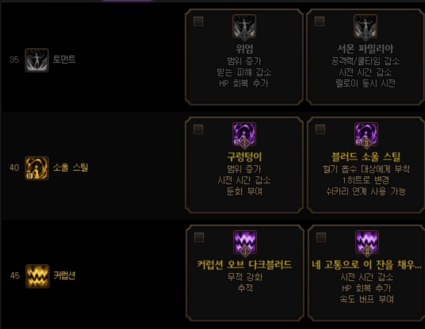 좌측이 혈기 흡수 적용 중일 때에요 소울 스틸 스킬에 불이 들어와있죠?