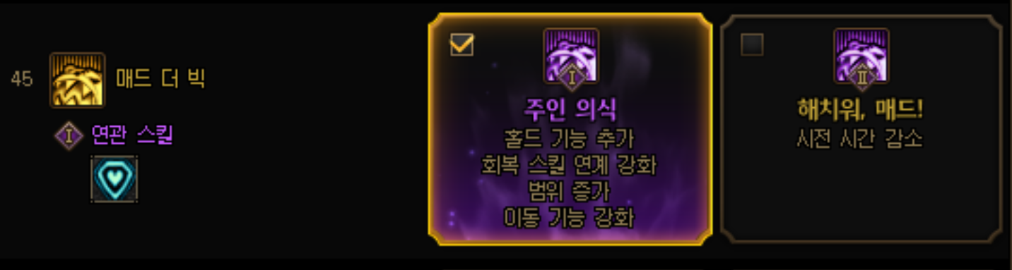 반드시 찍어야하는 필수 VP이고, 매드는 본인 무적 + 파티원 케어가 가능한 핵심 스킬이기 때문에 반드시 왼쪽 주인의식을 선택합니다.