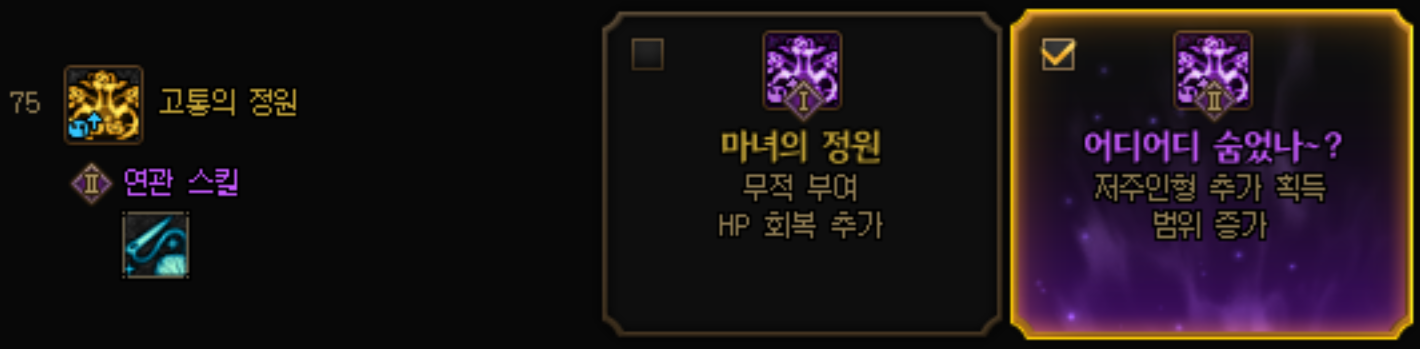 마녀의 정원의 경우 인챈의 무적기가 1개 추가됩니다. -> 이미 쿨타임이 충분하게 확보되거나, 너무 고여서 하던대로 하고싶은 분들에게 추천드립니다.
