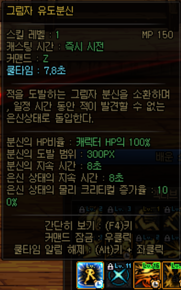 또한 [그림자 이동]을 사용하여 분신이 대신 스킬을 사용할 경우에도 섀도우 댄싱 효과가 적용되지 않는다는 것도 염두해두세요.