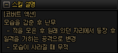 다만 이례적으로 암살 연계가 포함되어있어 [파디 or 연무 > 그림자이동 > 스팅 > 암살] 콤보를 쓸 수 있긴 한데
