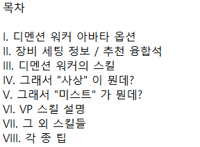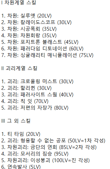 처음에 보여드린 3가지 요약 짤 중 마지막 부분 에서 그 외 스킬들 이라고 따로 분류를 했는데요, 스킬 명과는 별개로(EX 괴리: 모서리의 짐승) 차원 스킬과 괴리 스킬과는 다른 특징을 가지고 있기에 따로 분류 하였으며 하나하나 설명해 나가도록 하겟 습니다(길면 3줄 요약을 보셔도 무방합니다)