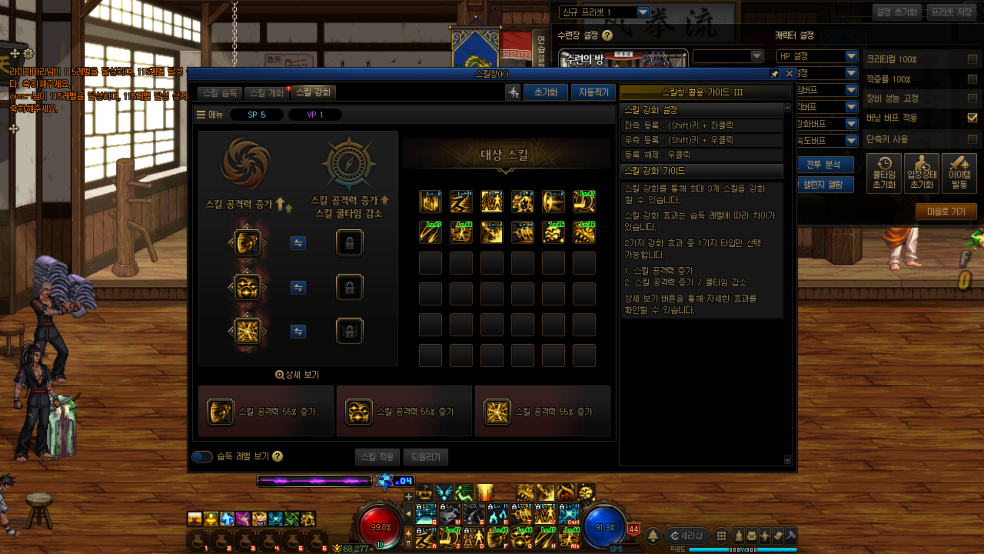 조작에 편의성을 더 높이고 싶으시다면 남은 스포를 칙 잇에 몰아 주시고, 모든 스킬이 쿨타임 일 때, 평타+연속발사를 사용하시면 됩니다