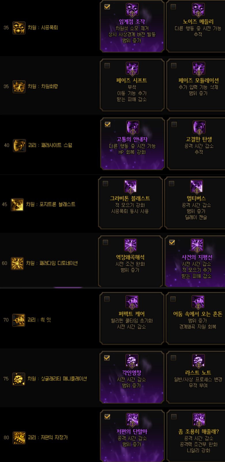 포지트론, 칙,잇 을 제외 한 무큐기 위주(35lv 이상 스킬)로 마스터를 한 후, 남은 스킬을 차원:실루엣 (20lv)에 준 스킬트리 입니다.