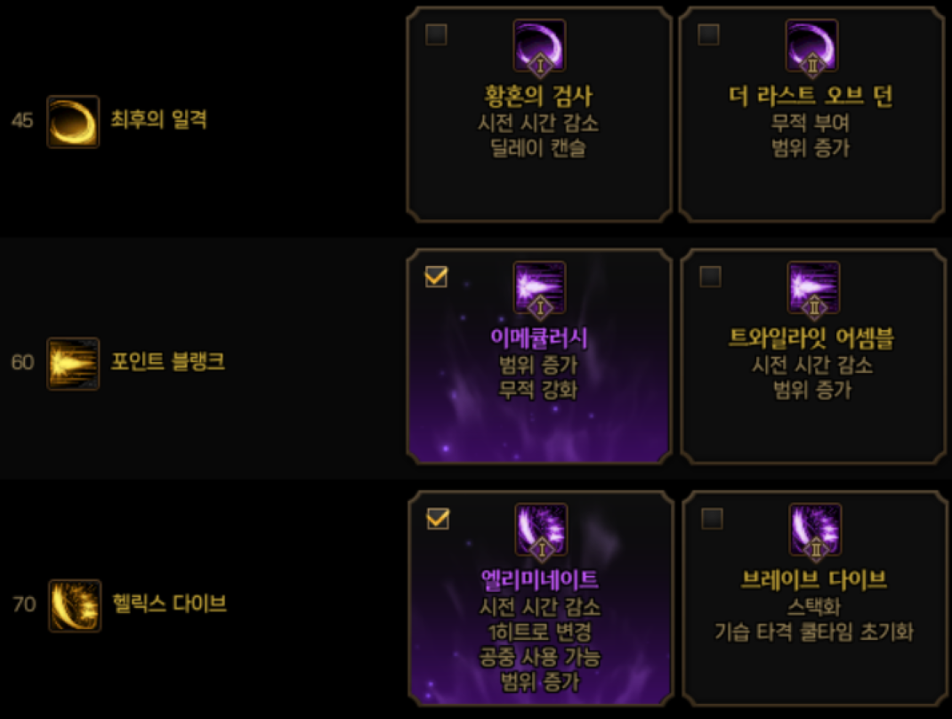 최후의 일격, 데드식스, 헬릭스 다이브를 내려 다른 스킬에 투자해도 좋습니다.