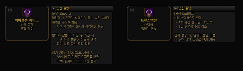 그 중 뇌천파쇄의 경우 기존 탈리스만 옵션 중 공중 사용 시 아주 아주 아주 좁은 타점을 가진 스킬로 변경되는 옵션을 받았습니다.