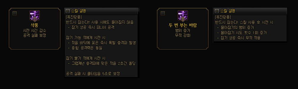 다른 그래플러 전직 스킬과 마찬가지로 [잡기 가능한 적]과 [잡기 불가능한 적] 대상으로 프로세스가 다른 스킬입니다.