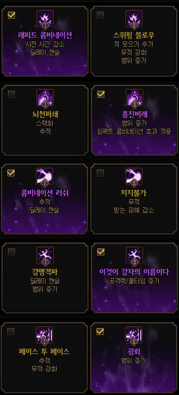 저는 현재 칠흑의 정화 세트를 장착하고 있기 때문에 쿨타임 감소가 충분하여 깡딜 강화만 채택하였으나,