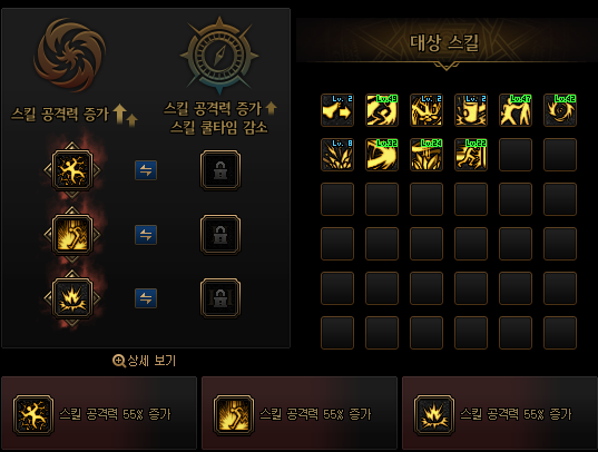 스킬 공격력 55% 증가 옵션과 스킬 공격력 38% 증가+쿨타임 감소 15% 두 가지 중 하나를 택하실 수 있습니다.