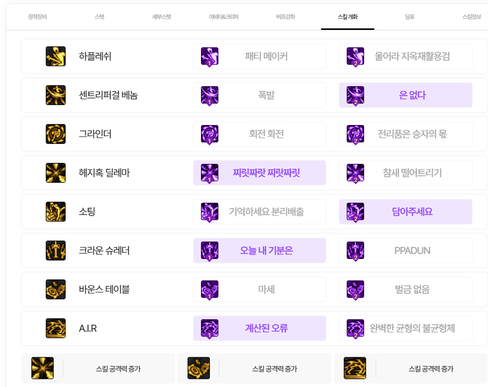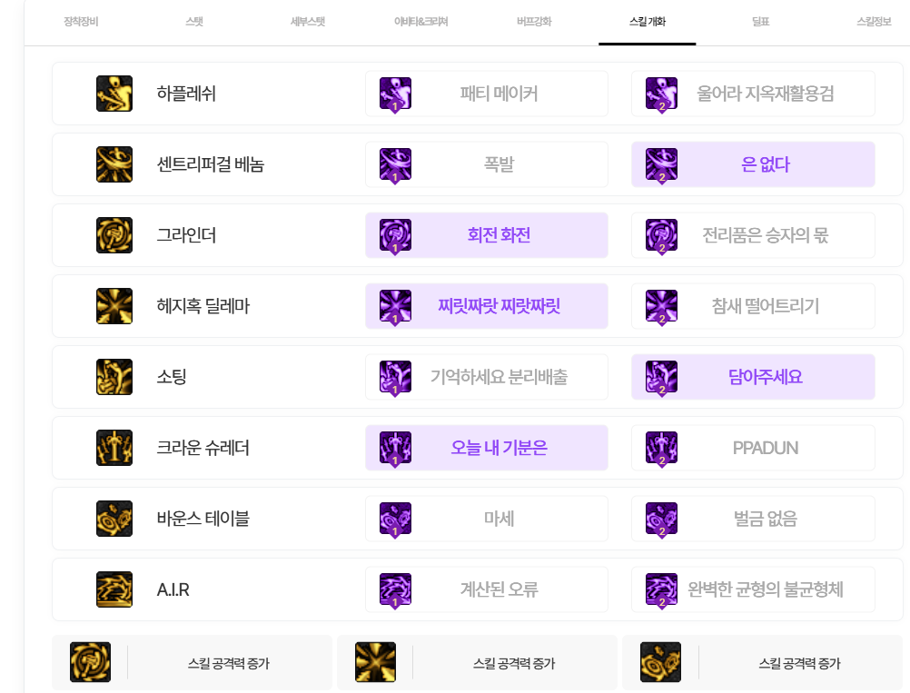 A.I.R의 개화와 강화를 빼고 그라인더의 개화 회전화전과 강화를 해주시고, 브이 투 제로 대신 리니어 대거로 바꾸면 딜이 대폭 상승합니다.