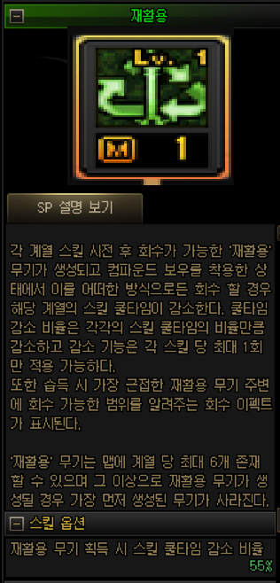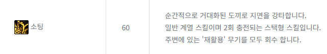 무기를 다시 회수하면 재활용 패시브로 스킬 쿨타임이 55% 감소하고, 화려한 분리수거 패시브로 회수 공격이 들어갑니다.