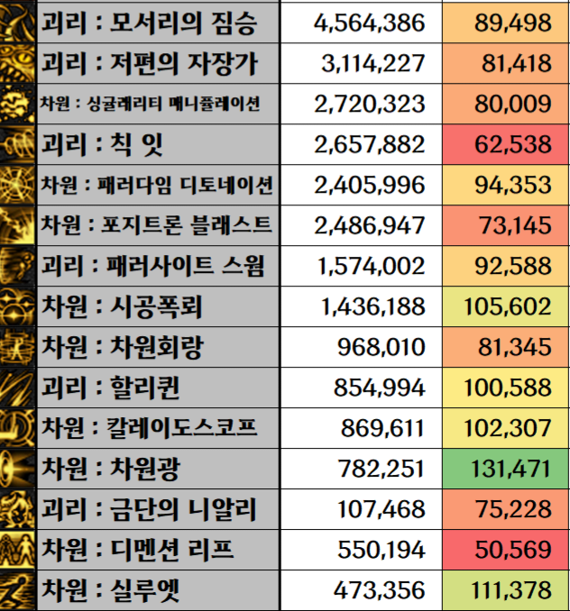하지만 칠흑 세트가 아닌 이상 만쿨감을 달성하는것은 불가능하고 대부분의 디멘션워커 유저들이 쿨타임 감소 50% 이하인 부분도 고려해서 글을 썼습니다.