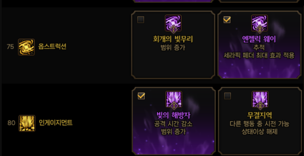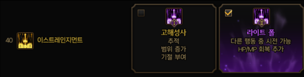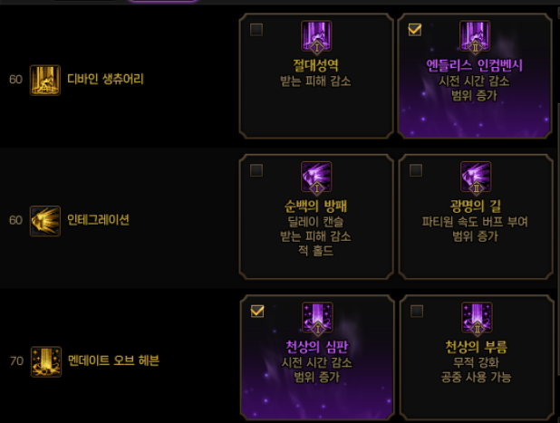 힐 스킬을 사용하지 않는 분들은 디바인 생츄어리를 빼고 포기브니스 1,2나 인테그레이션1을 선택할 수 있겠네요.