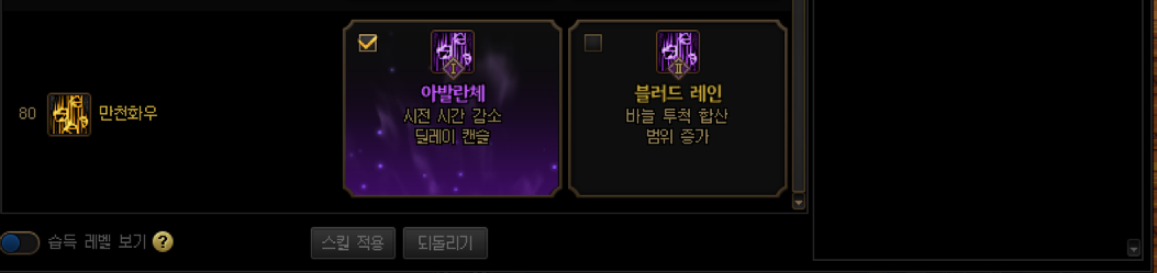 위 스킬트리의 장점은 안정적인 스킬 사이클 및 딜 누수가 적어 저점을 확보하고 고점또한 갱신된 스킬트리 입니다.
