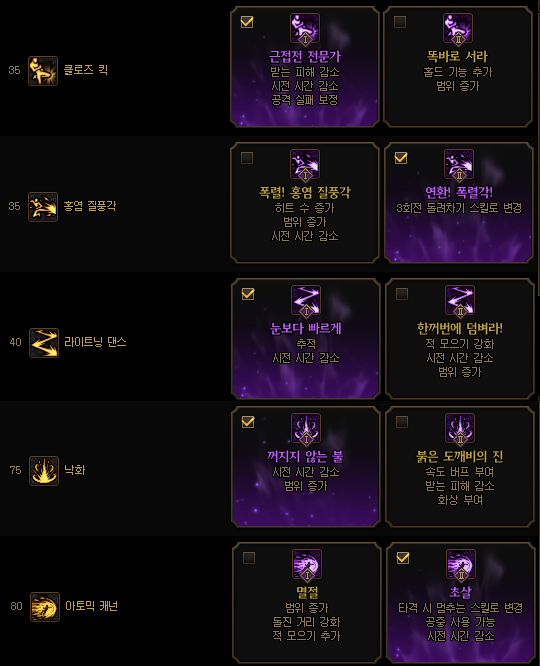 빨간색 네모 박스인 35제 두 스킬(홍염 질풍각, 클로즈 킥)은 고정으로 선택해주시고