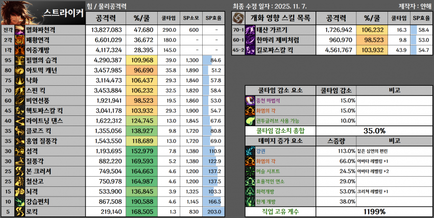 밸런스 패치 이후로는 위의 계수표를 보시면 아시겠지만, 퍼쿨과 SP효율 등등이 어느 정도는 평준화가 되었습니다.
