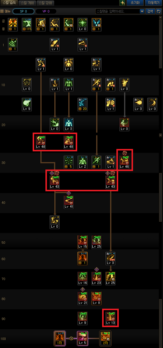 빨간색 네모는 패황의 주력 스킬 및 필수적으로 마스터 하시기를 추천하는 스킬입니다.