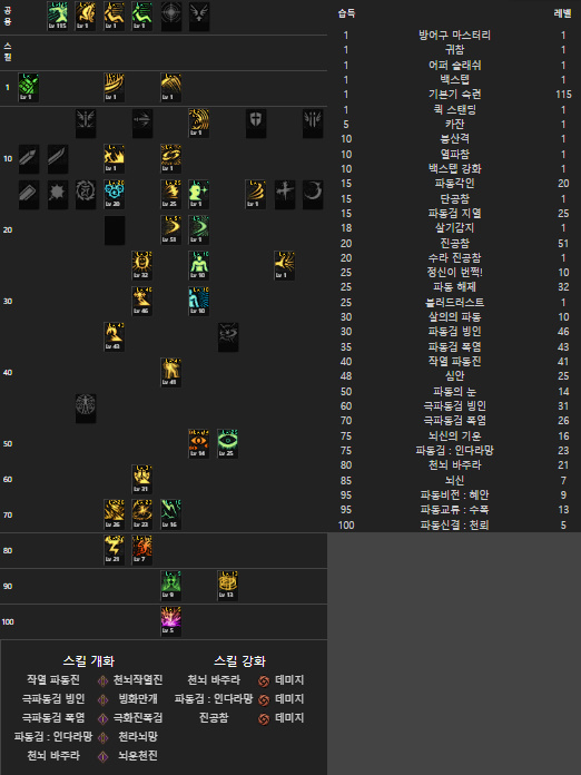 던담 최적화용이라고 한 것은 스킬 개화 부분인데 일반적으로 현재 던담딜이 제일 많이 나오는 개화 투자입니다.