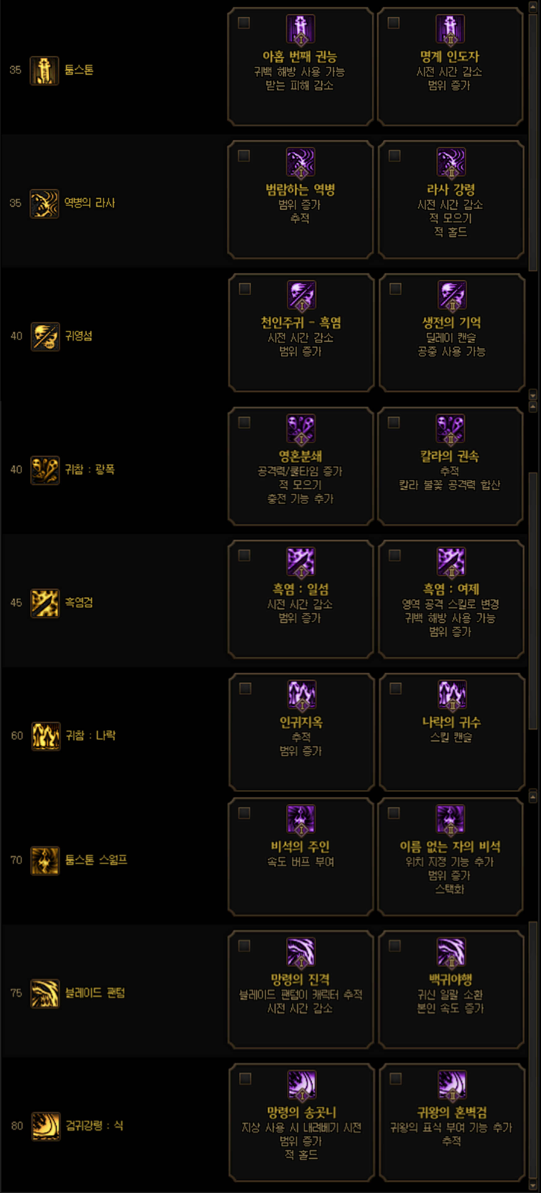 - 35~80제의 스킬로 구성되어 있으며, 그 중 스킬 3종을 강화합니다.