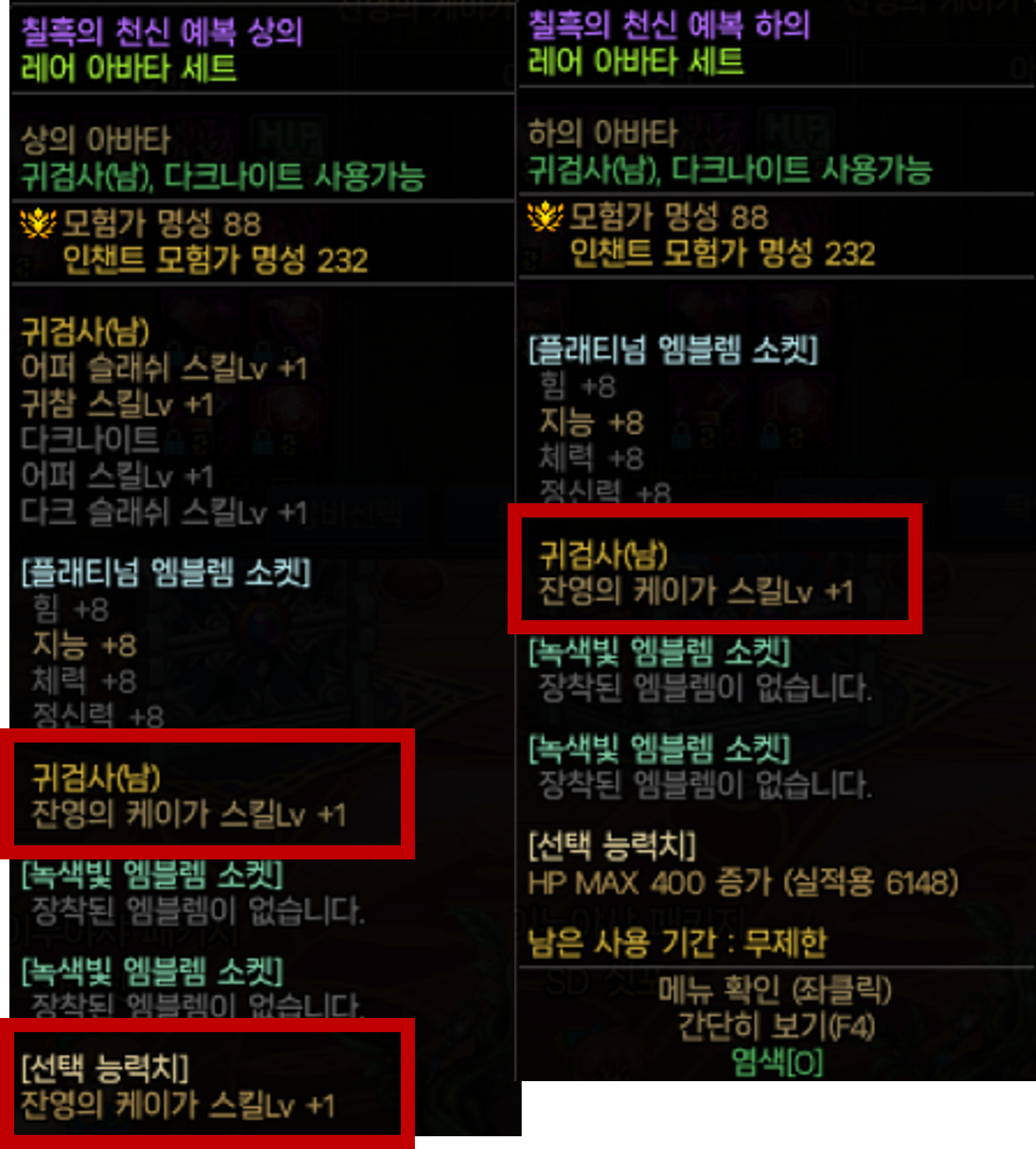 - 아바타와 엠블렘 옵션 모두 잔영의 케이가를 선택하여 버프 강화에 등록하시면 됩니다.