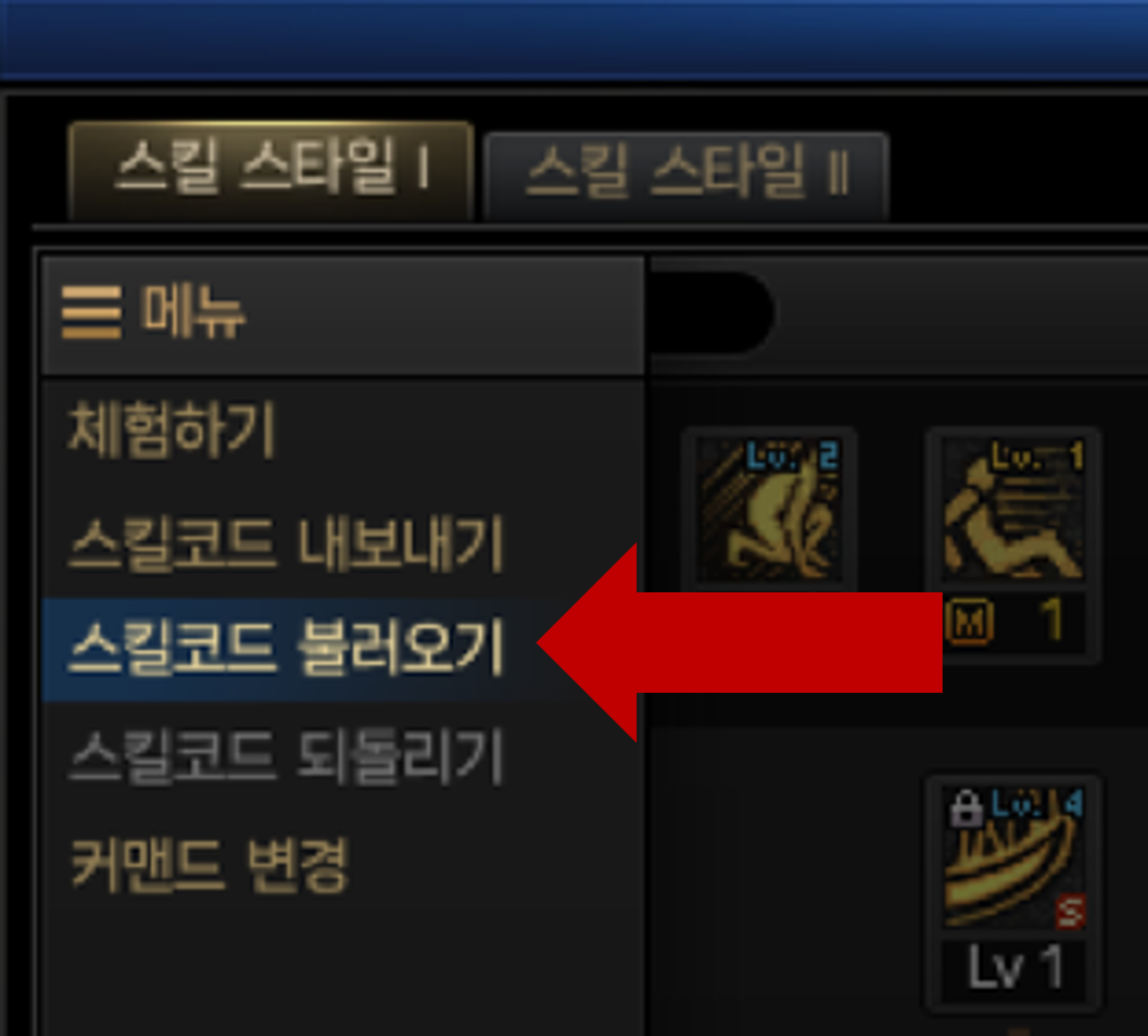 - 위 스킬 코드 복사하셔서 아래의 이미지 참고해서 불러오기 하시면 됩니다.