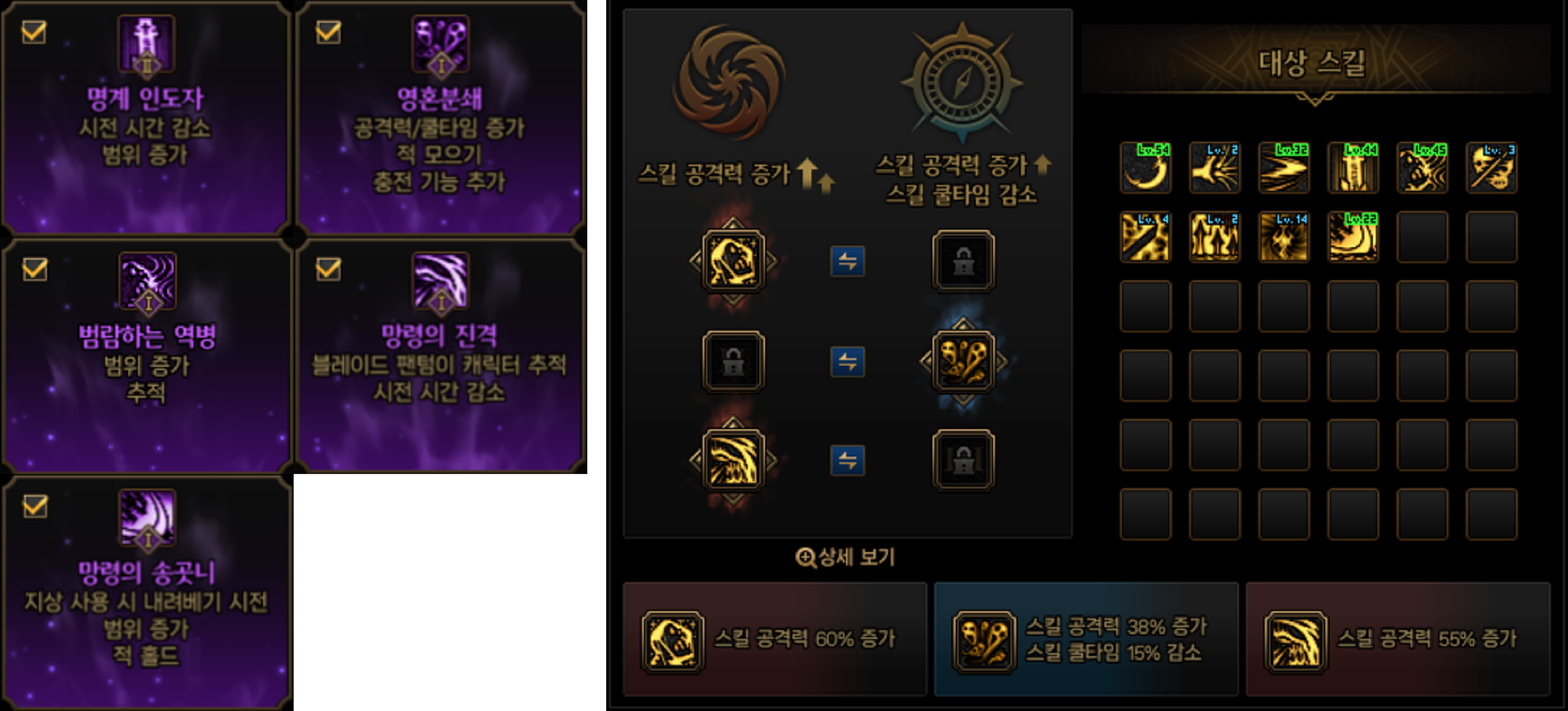 - 스킬의 기능을 변화시키는 옵션을 제공합니다.