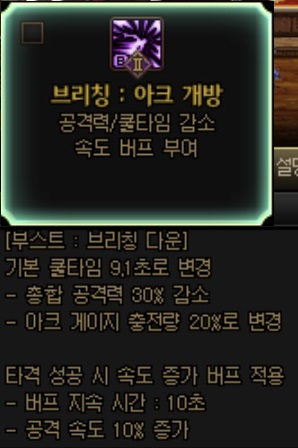 쿨타임과 공격력을 감소시키고 속도 버프를 제공합니다.