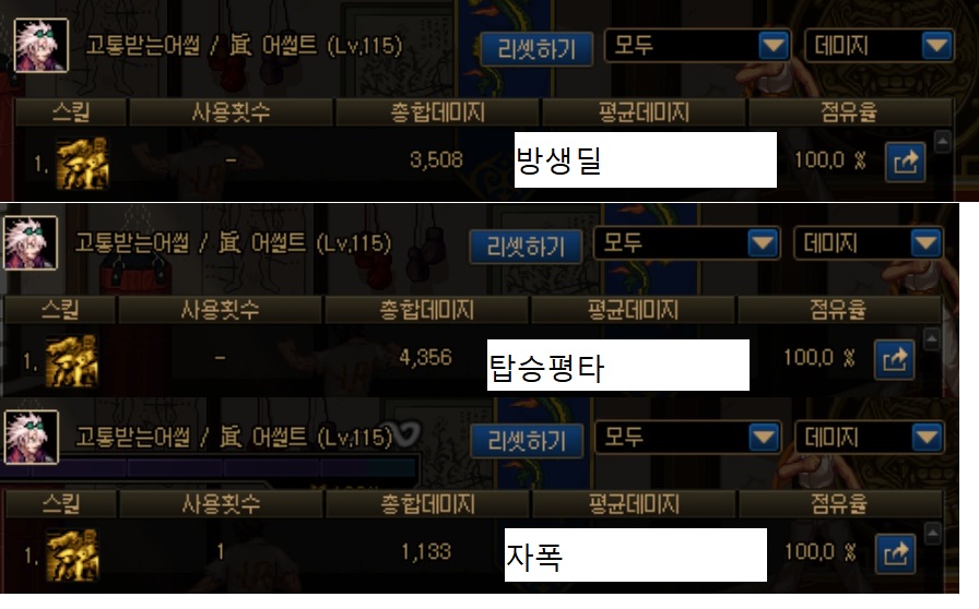 위에서부터 30초 방생딜, 30초 탑승평타(공속 130%), 자폭딜입니다.