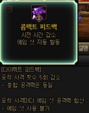 다이렉트 피드백은 쿨타임감소를 찍고, 에임샷을 공격력 증가를 찍어둔다면 효과는 더욱 극대화됩니다.