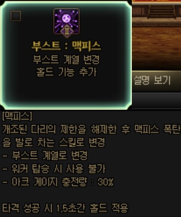 워커에서 사용할 수 없는 스킬 특성상 쿨타임이 비교적 높지 않은 이 스킬은 투자를 권장하지 않습니다.