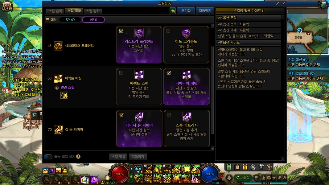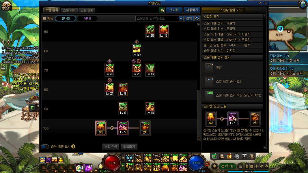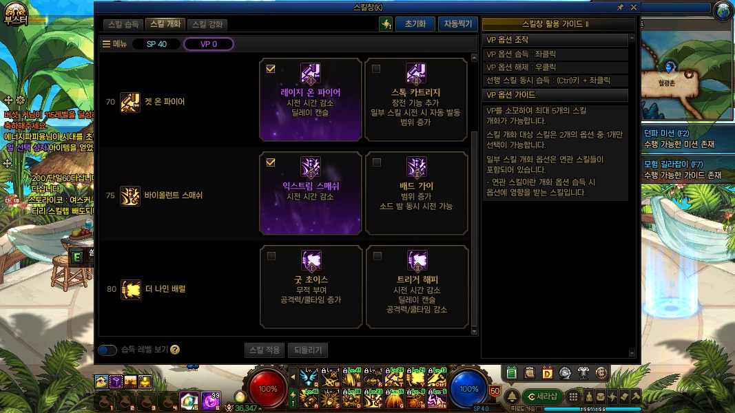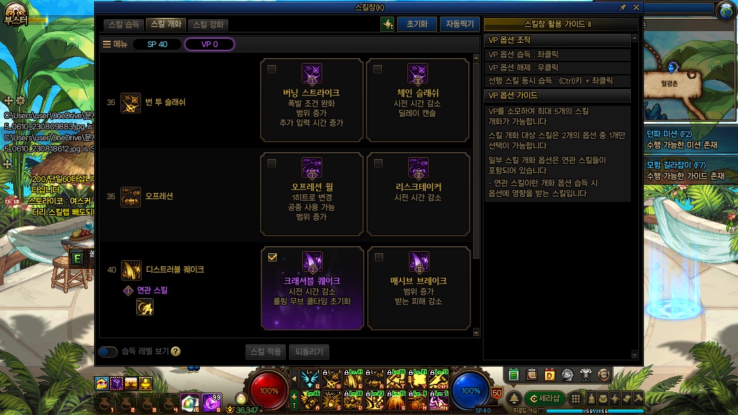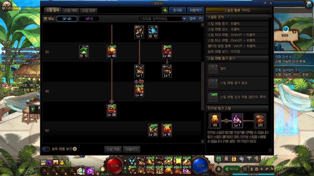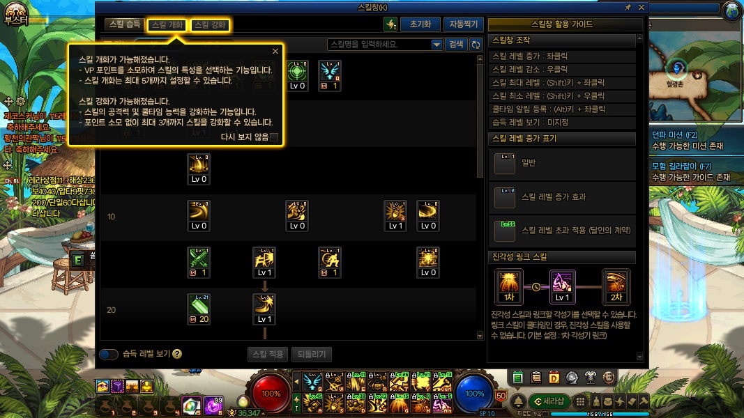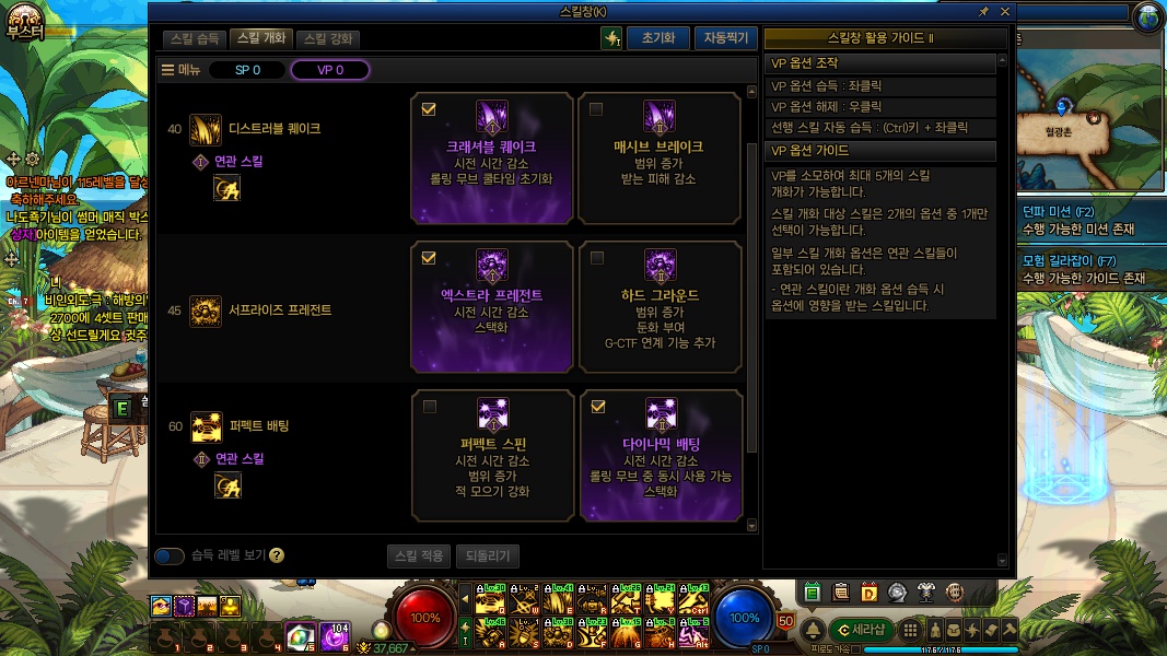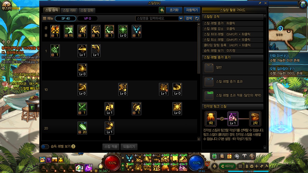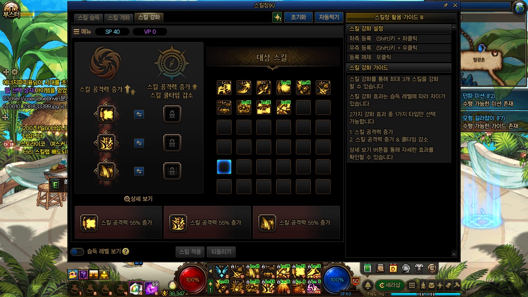 불필요한 스킬은 스킬창에서 내려놓은뒤 연계스킬을 올려놓고 쓰시면 간편하고 쉽게 게임을 즐길 수 있습니다.