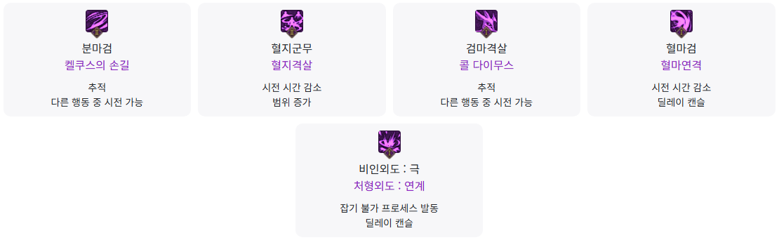 분마검 > 혈지군무 > 검마격살 순으로 쿨타임이 높으니 무력화 ( 극딜 & 아포 ) 타임 계산해서 사용해주시면 됩니다.