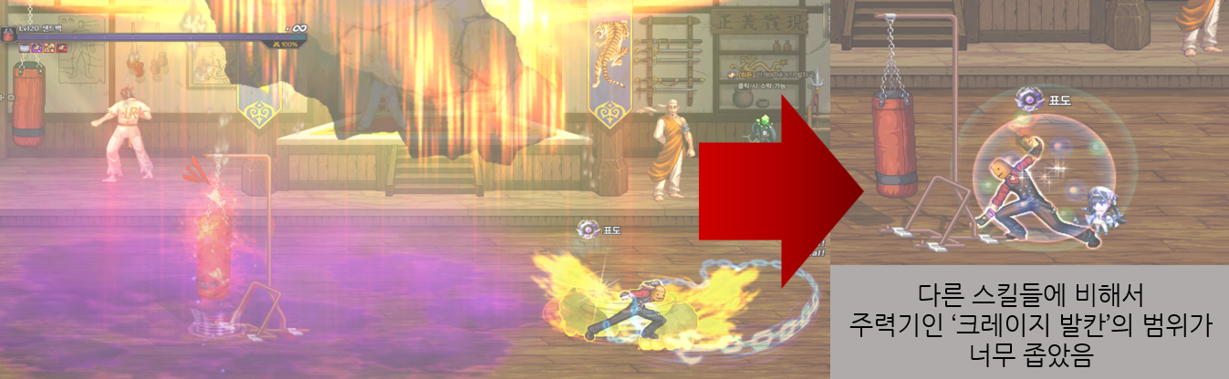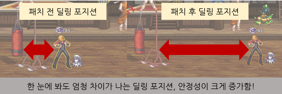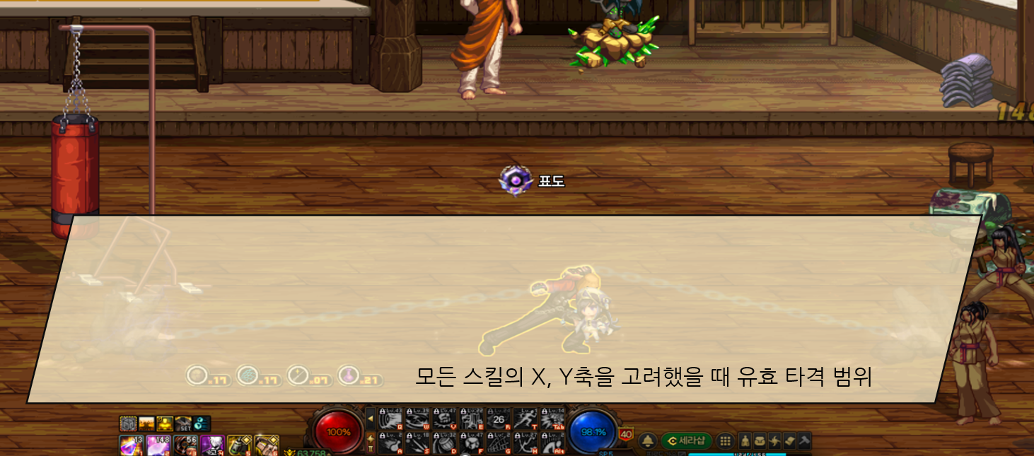 모든 스킬을 히트시킬 수 있는 거리가 기존에 비해서 X축이던 Y축이던 모두 널널해졌다는 장점이 있으며,
