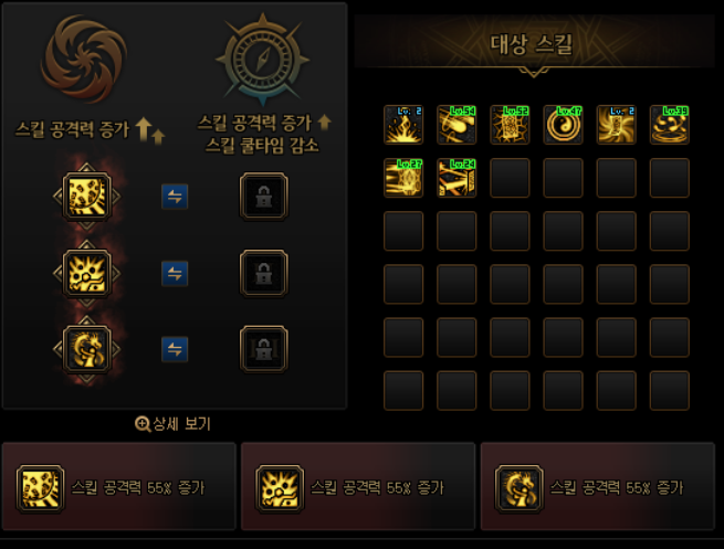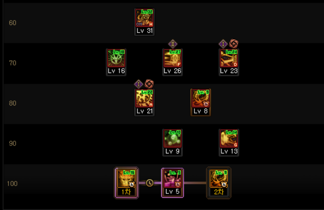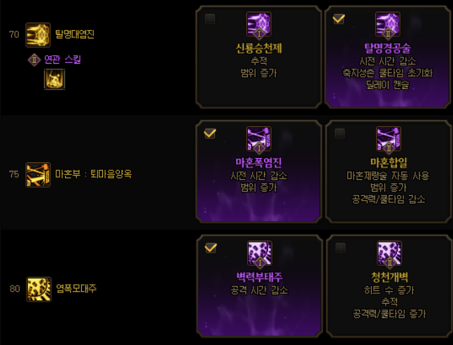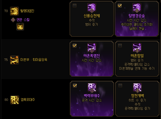 심플하게 전방에 있는 적을 부적으로 때린다 라는 개념의 스킬들입니다. 70,75,80제를 채용하고, 칠흑 세트의 경우 시폭염화부를 찍고, 아닐 경우 찍지 않습니다.