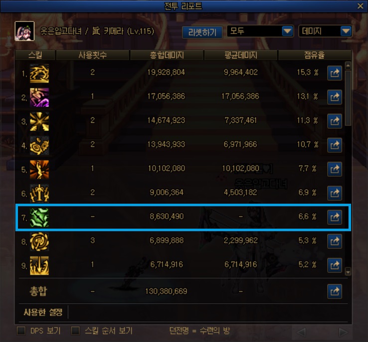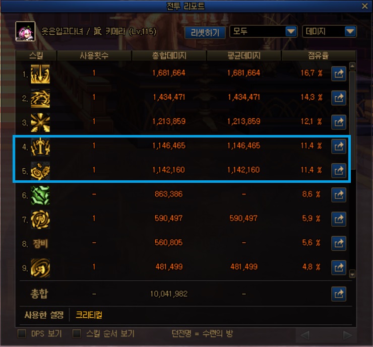 스킬 개화만 찍고 강화는 찍지 않은 딜표입니다.