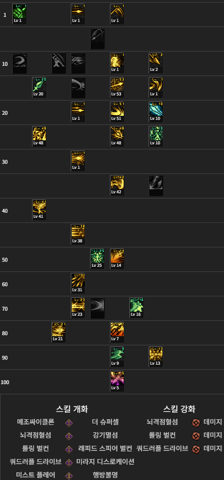 스킬강화는 뇌격점혈섬, 쿼드러플 드라이브, 롤링벌컨을 공격력강화로만 채용했습니다!