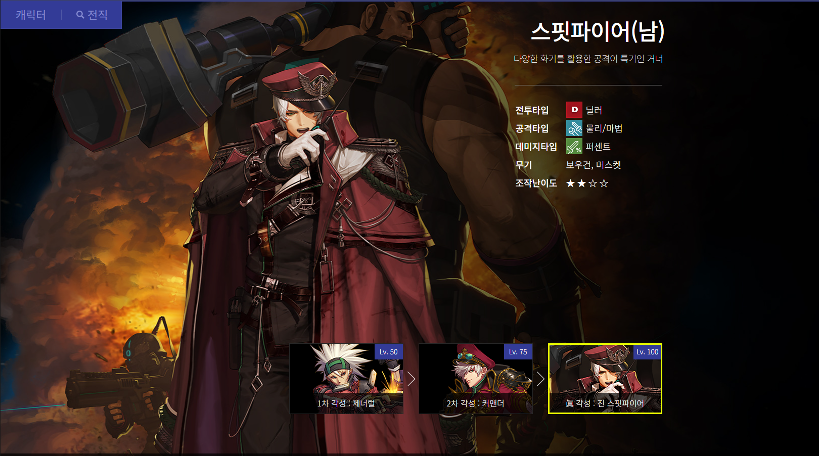 스핏파이어(남)는 물리,마법공격을 본인이 선택할 수 있는 하이브리드 퍼센트 딜러입니다.
