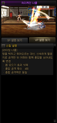 기존의 공중에 뜨는 라이징너클과 달리 엘보공격1회+어퍼컷풍압4회로 공격하는 지상스킬로 바뀌게 됩니다.