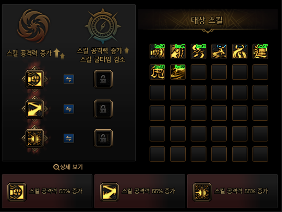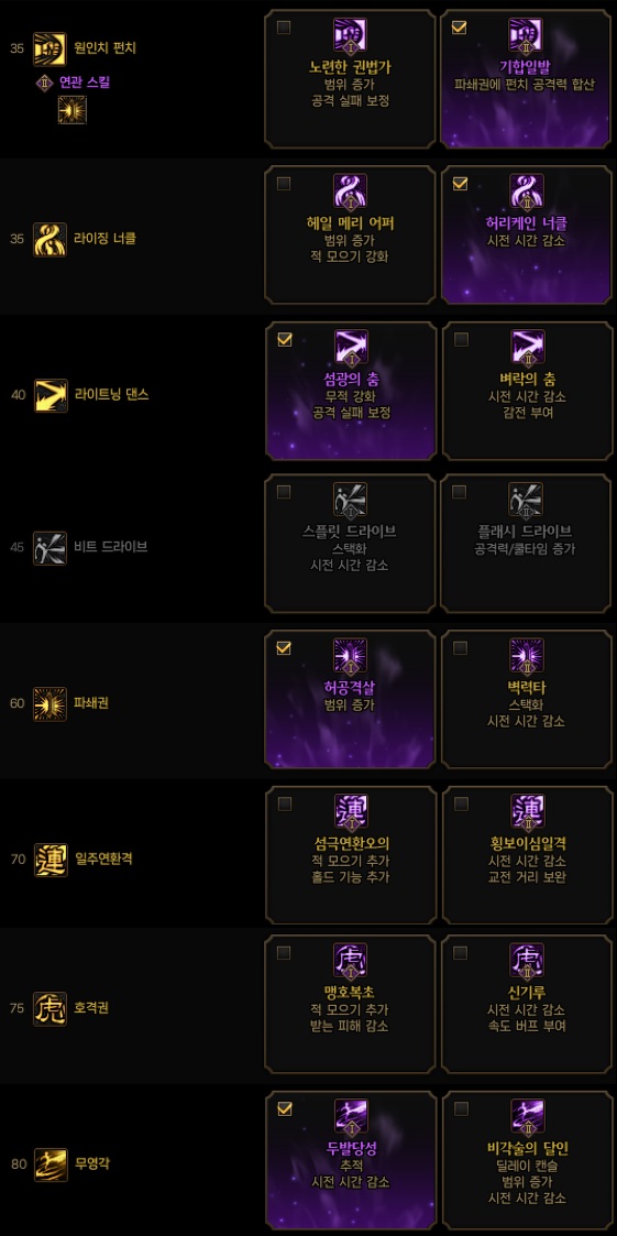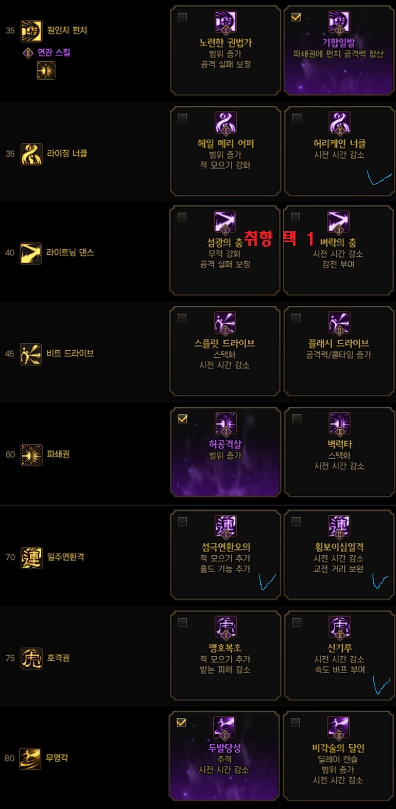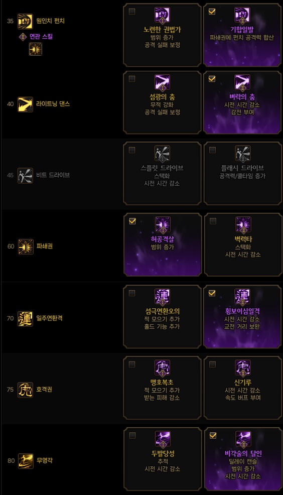 스킬강화는 쿨타임이 돌때마다 안정적으로 사용할 수 있는 스킬인 원인치펀치 / 파쇄권을 스킬공격력 증가로 넣었고 남은 하나는 무적+주력기인 라이트닝 댄스로 넣었습니다.