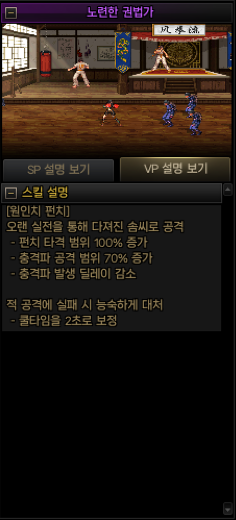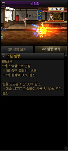 타격 범위가 좁아 맞추기 힘든 원인치펀치를 쿨타임마다 완벽하게 딜링할수있게 해주는 엄청난 vp입니다. 뒤에 나올 파쇄권 1번 범위vp와 세트로 묶어 필수로 채용합니다.