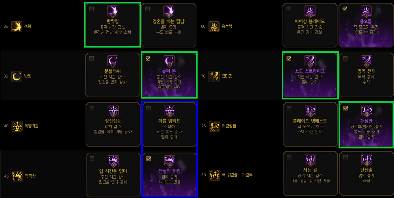 전설의 재림 OR 더블 임팩트 둘 중 하나는 선택인 듯 합니다 소검소마 기준이며 도, 대검의 경우 전설의 재림 사용하시면 좋습니다.