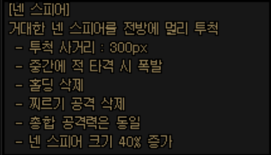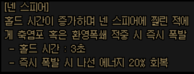 사용감은 꽤 괜찮은데 그놈의 빗나감때문에 꺼려지는 스킬이 이 넨 스피어인지라, 채용을 적극 고려해볼 VP입니다.