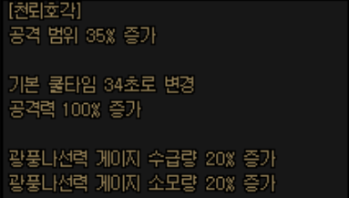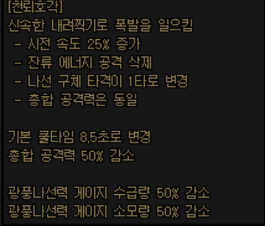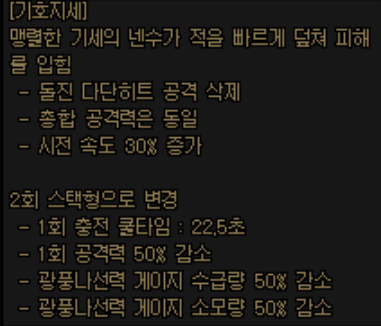 쿨타임과 공격력, 광풍나선력 게이지 관련을 모두 절반으로 변경합니다.