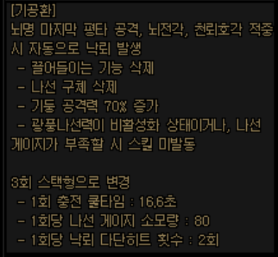 뇌전각 및 천뢰호각이야 자주 쓰는 스킬이니 기공환 스택이 놀 일은 없겠지만..나선 게이지와 관련하여 문제가 될 가능성이 있습니다.