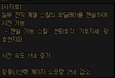 시전 속도 상승은 어지간한 스킬에서 굉장히 환영받은 개선이지만, 사자후는 그 발동속도 자체가 워낙 빠른지라 큰 체감이 나지 않습니다.