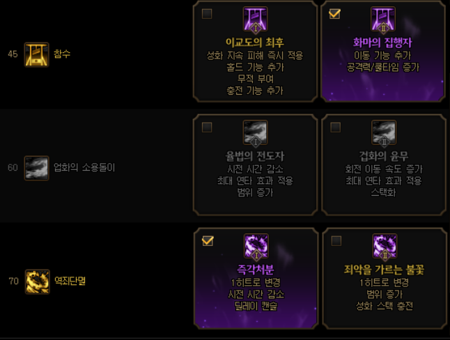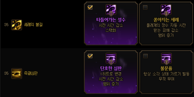 신벌 - 역죄단멸 - 척결의 역십자 - 정수 - 고결한 격노 - 심판의 일격 - 세례 - 즉결심판 - 세례 - 성염의 쇄도 - 성화 - 각성기