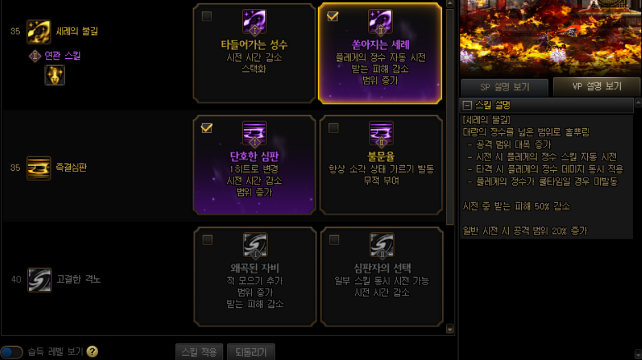 스킬 설명 전에, vp를 찍어야만 캔슬이 가능하고 스킬 구조가 깔끔해지는 스킬이 있어 이를 먼저 소개하고, 콤보 설명을 드리겠습니다.