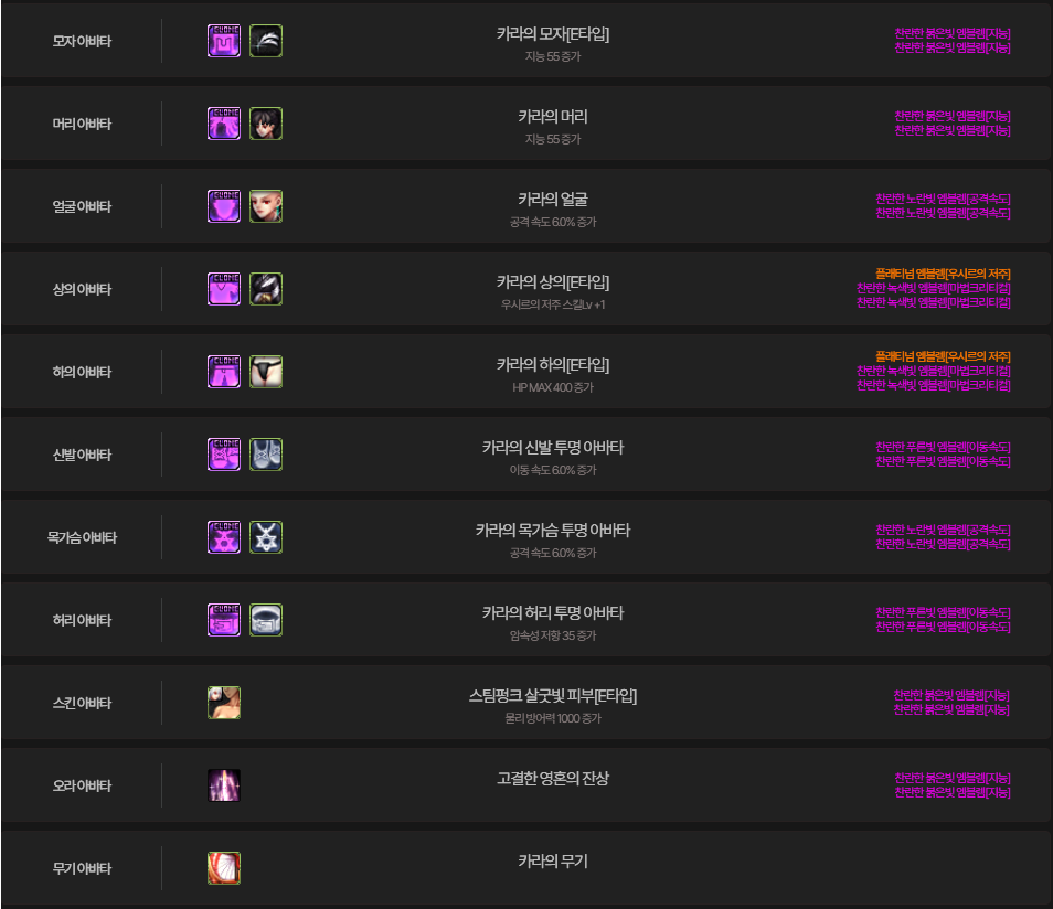 암제의 스킬 구조상 쿨타임 감소 효과를 상당히 잘받기 때문에 칠흑의 정화 세트로 가주시면 좋습니다.