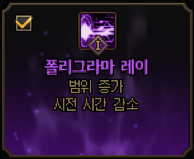 블랙미러에 속도 버프를 부여해주고 지속시간이 늘어납니다. 기존 2타맞추면 딜이 더 안들어가기 때문에 채용할 이유가 없는 VP입니다. | 블랙미러 범위 지정없이 즉시 캐릭터 주변으로 시전되며 범위가 상당히 커지고 1회 타격으로 바뀝니다. 블랙미러의 단점을 모두 없애주는 VP라 찍어주시면 좋습니다. |