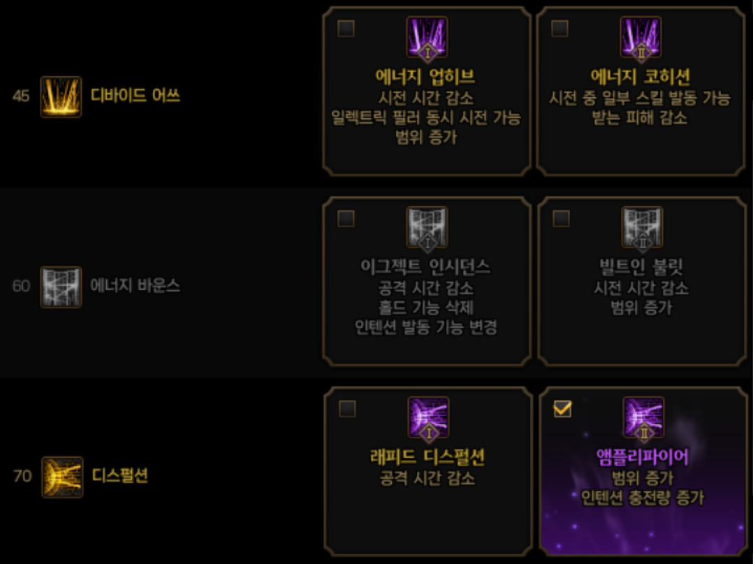 개화 1 : 에너지 업히브 (시전 시간 감소, 일렉트릭 필러 동시 시전 가능, 범위 증가)